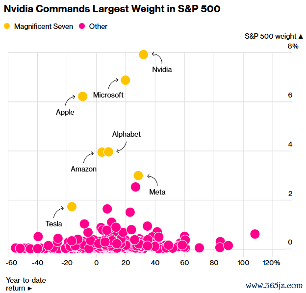 英伟达的占比范畴在标普500指数中位居榜首,占比近 8%,其在东谈主工智能发展范围的中枢性位使其成为通盘商场的风向标。这家科技巨头的居品无处不在,其 40%的营收来自 Meta(META.US)、微软(MSFT.US)、Alphabet(GOOGL.US)和亚马逊(AMZN.US)——这些公司均位列标普500指数的前十大权重股之列。